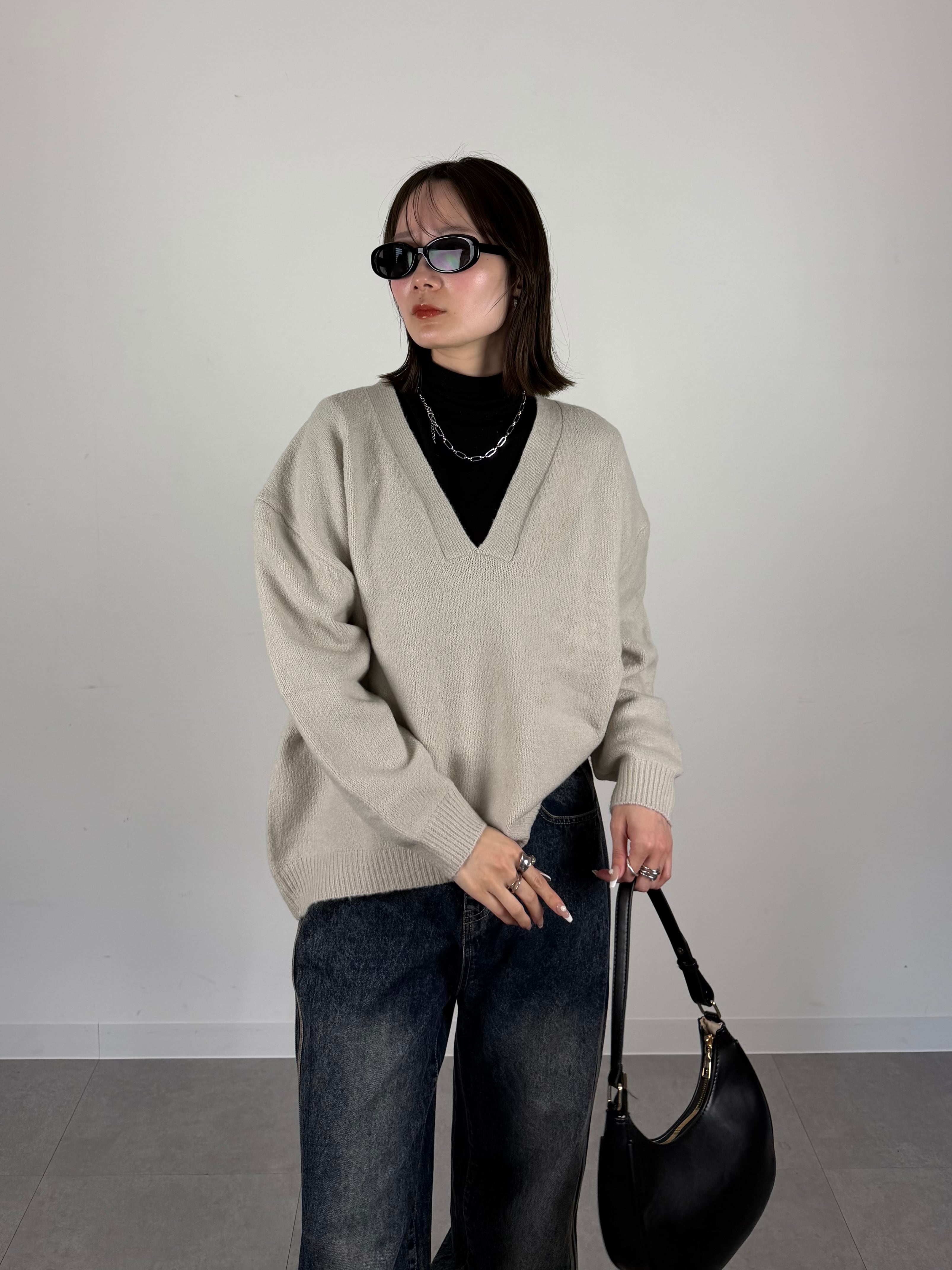 軽やかなニット素材を使用しており、ソフトな肌触りで快適な着用感を実現。深Vネックはレイヤードスタイルに取り入れることで、シャツやタートルネックとの重ね着を楽しめるのが魅力です。シンプルながらも存在感があり、一枚でこなれ感を演出できるアイテムです。
