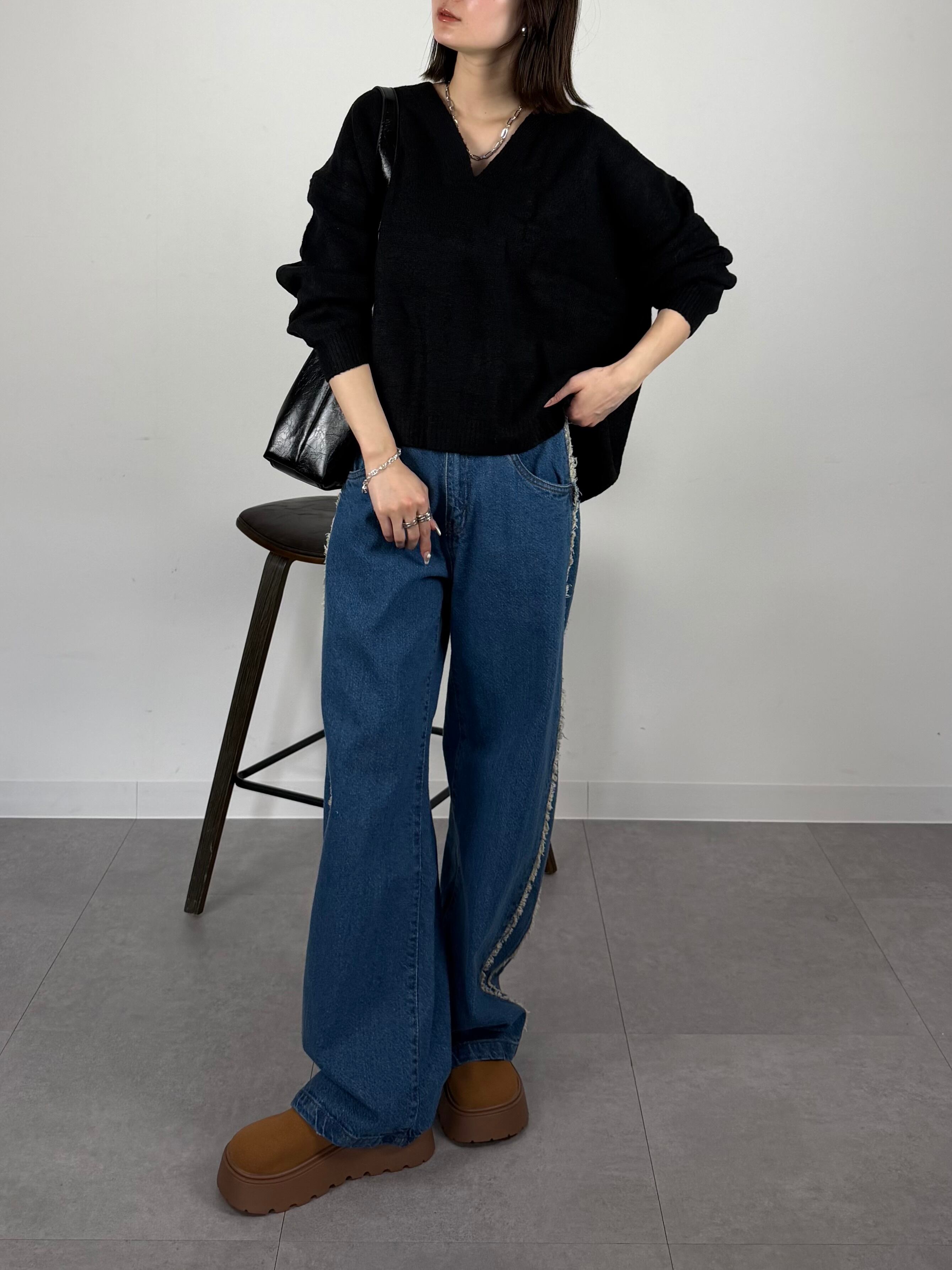 【深Vネックで魅せる 大人のレイヤードスタイル】