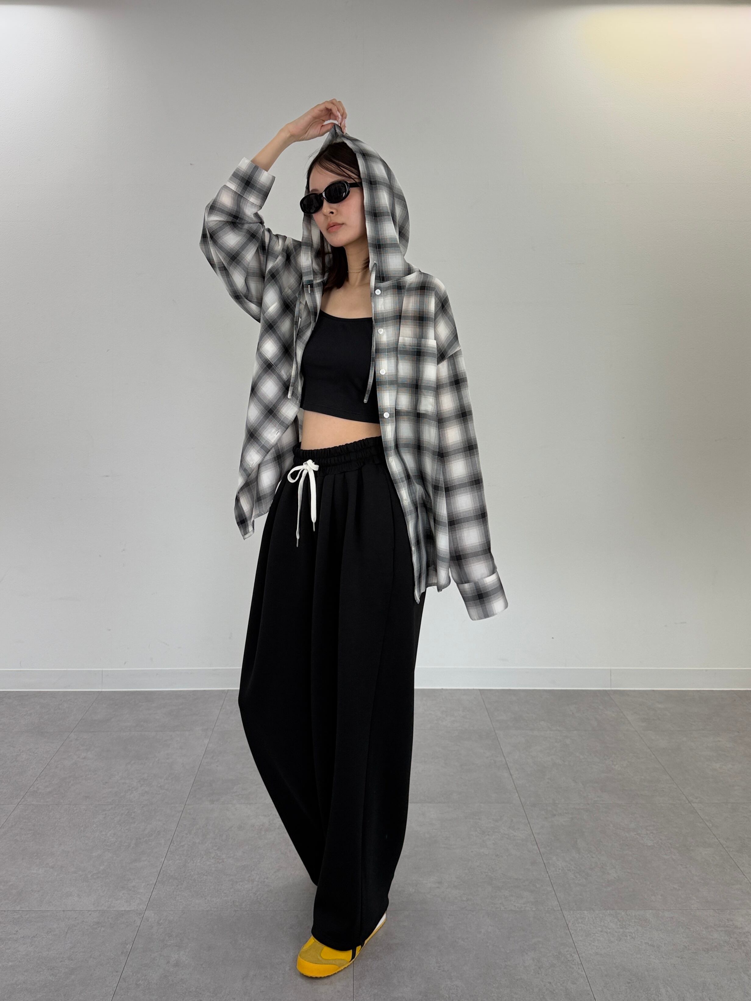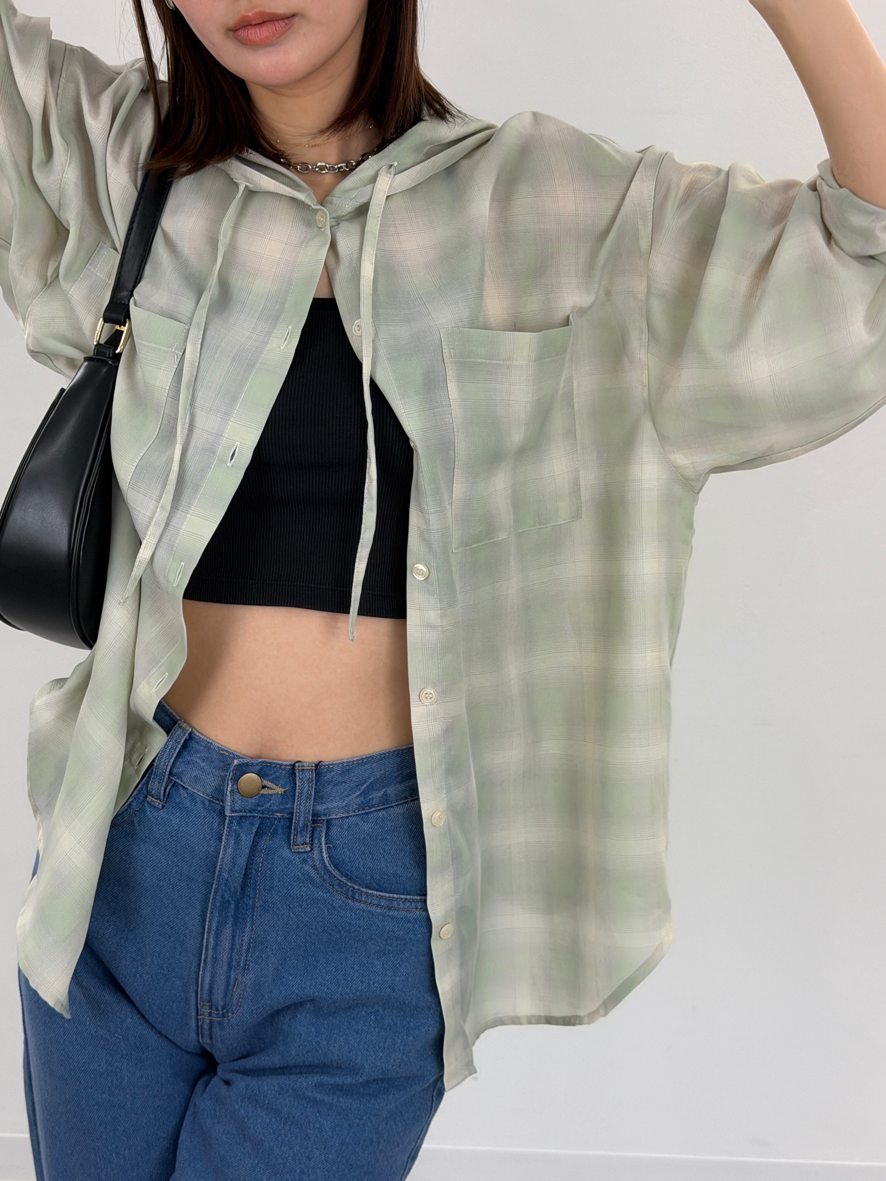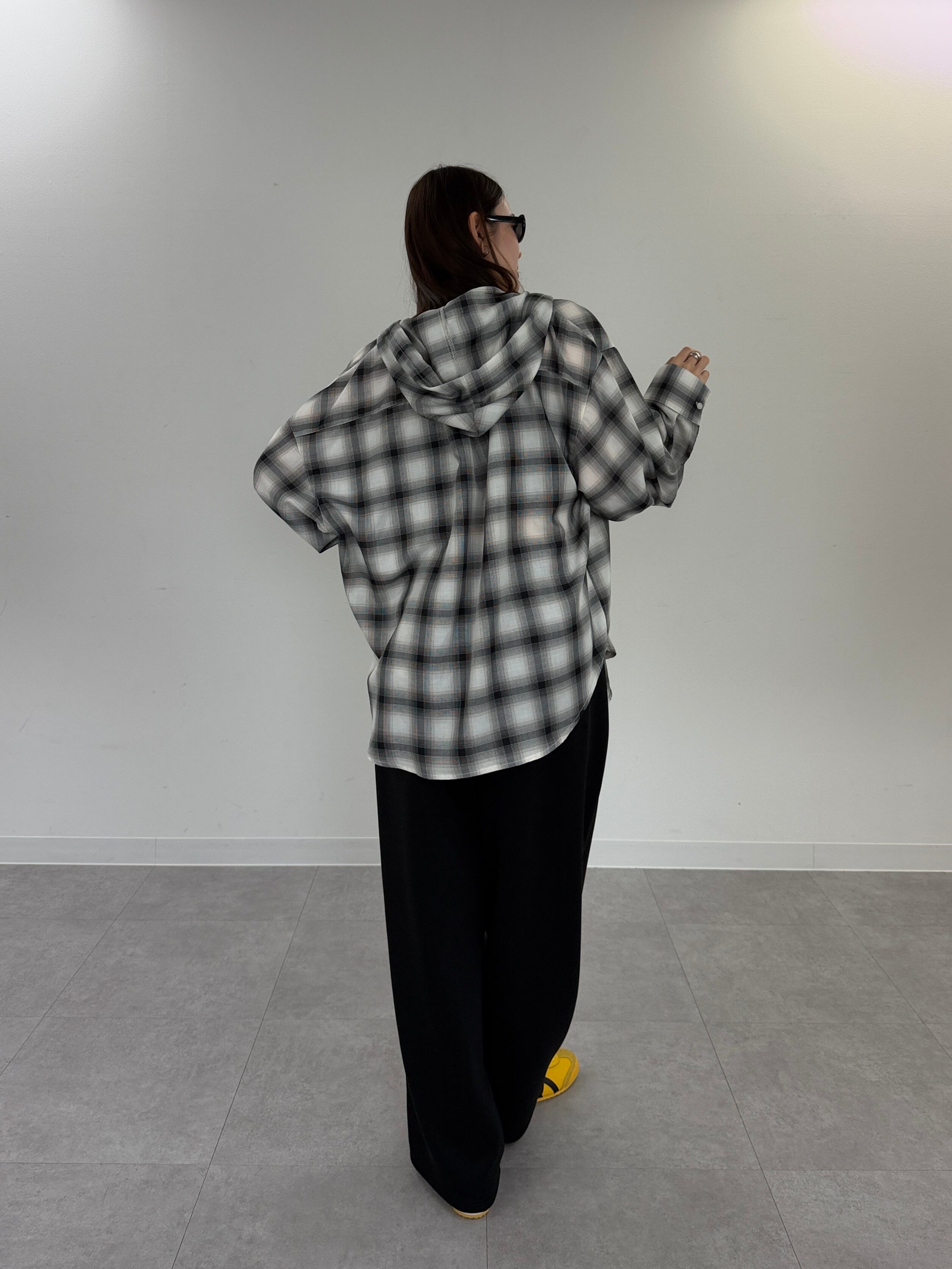 先染めのシアーチェック素材を使用した、ボリュームスリーブデザインのフードシャツ。