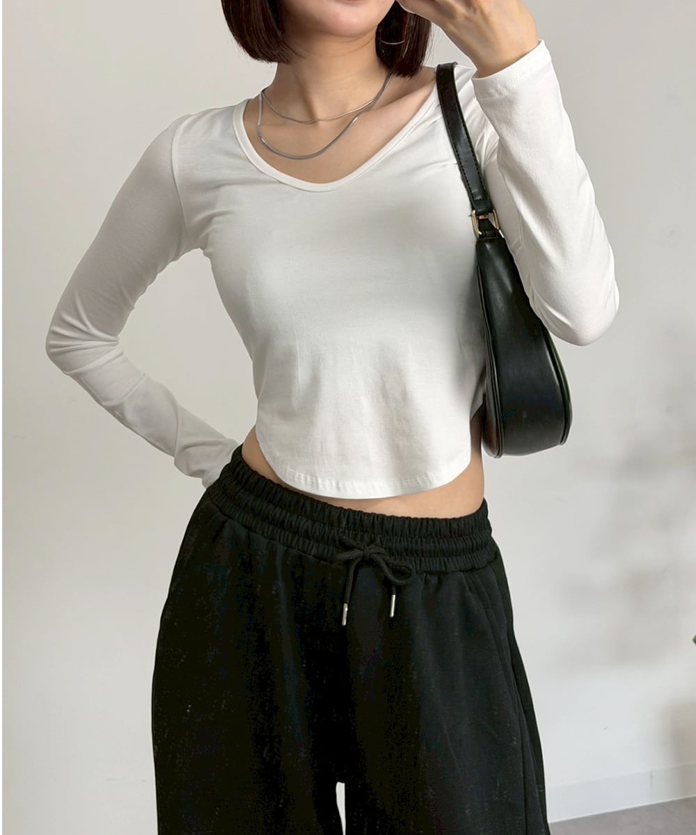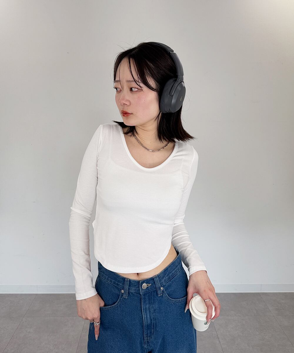 裾がラウンドになったタイトなシルエットのTシャツ。シンプルながらもスタイリッシュなデザインで、韓国ストリートスタイルを取り入れることができます。細見えするフォルムが特徴的で、トレンド感あふれるコーディネートを楽しむことができる一枚です◎