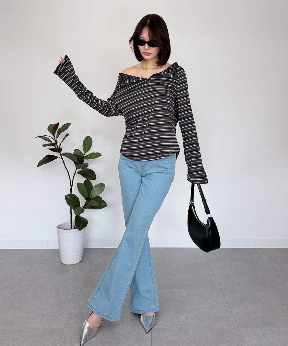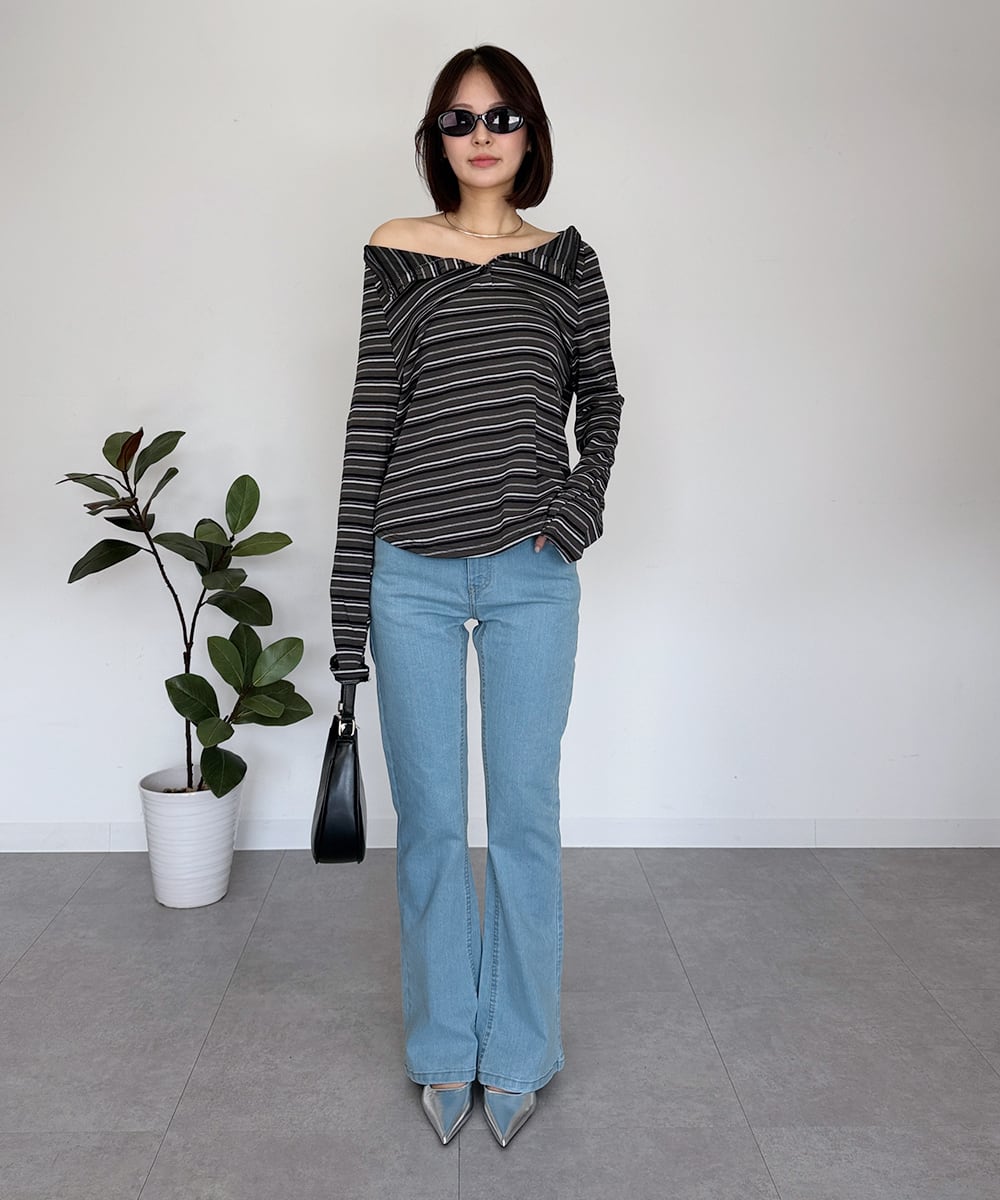 オフショルのデザインを活かして、ルーズデニムやフレアパンツと合わせるとバランスの良いコーディネートが完成!カジュアルなお出かけにもぴったりな一枚です◎